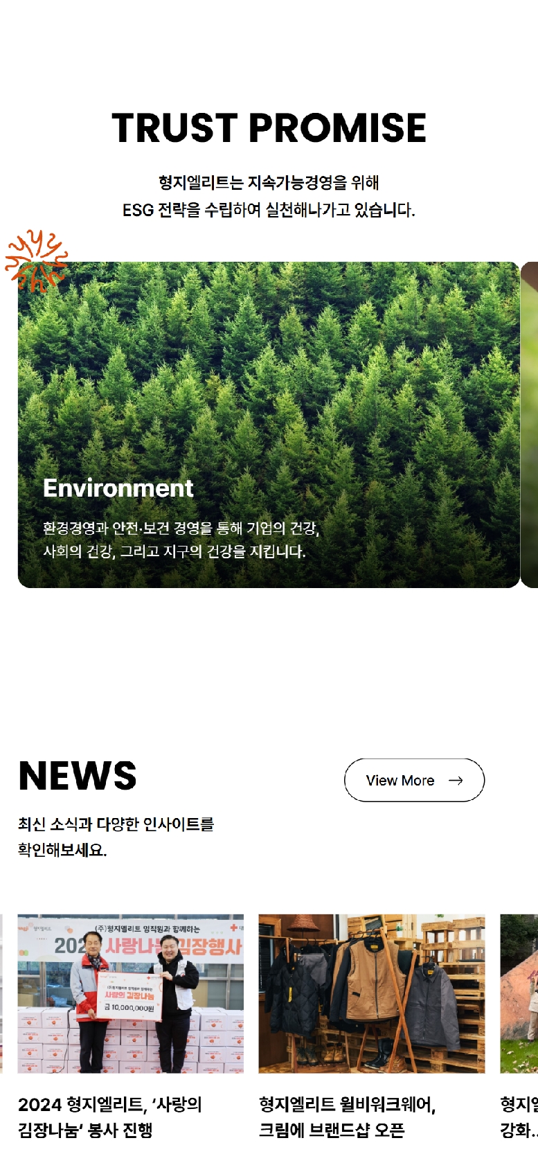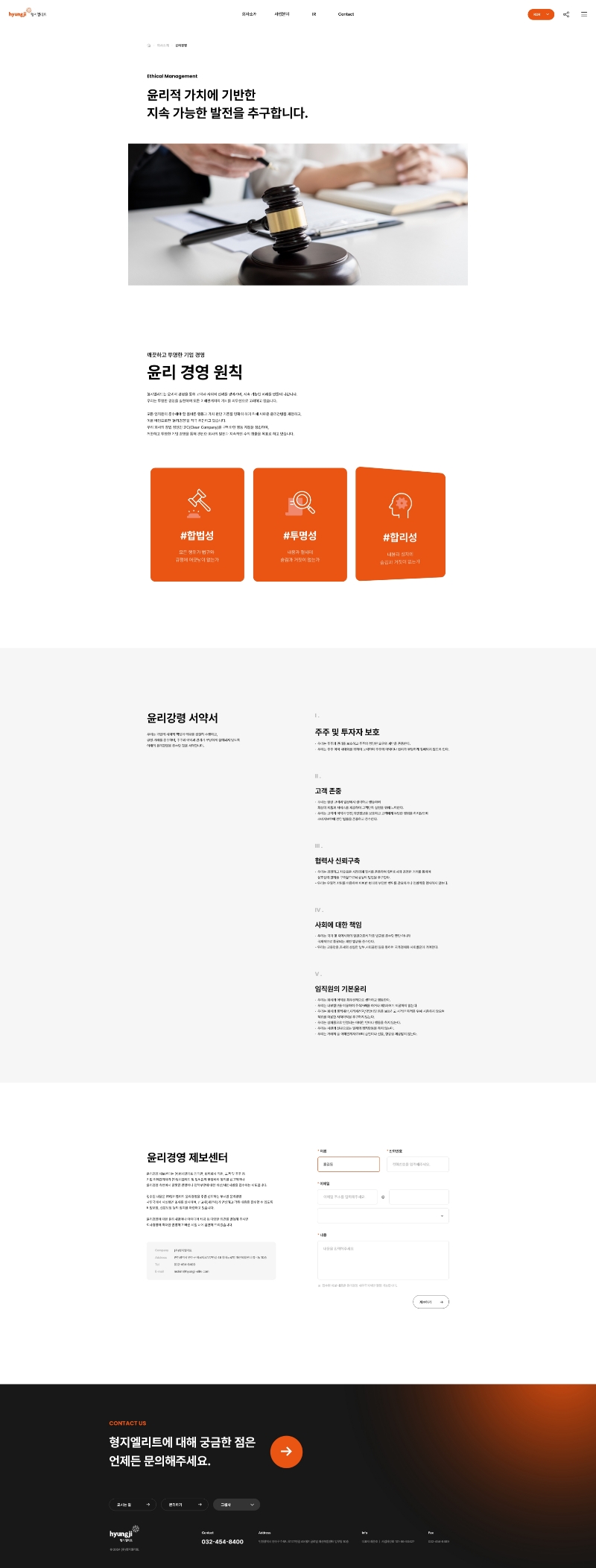 형지엘리트의 홈페이지 디자인 시스템은 오렌지와 블랙 컬러를 활용해 강렬하면서도 신뢰감을 주는