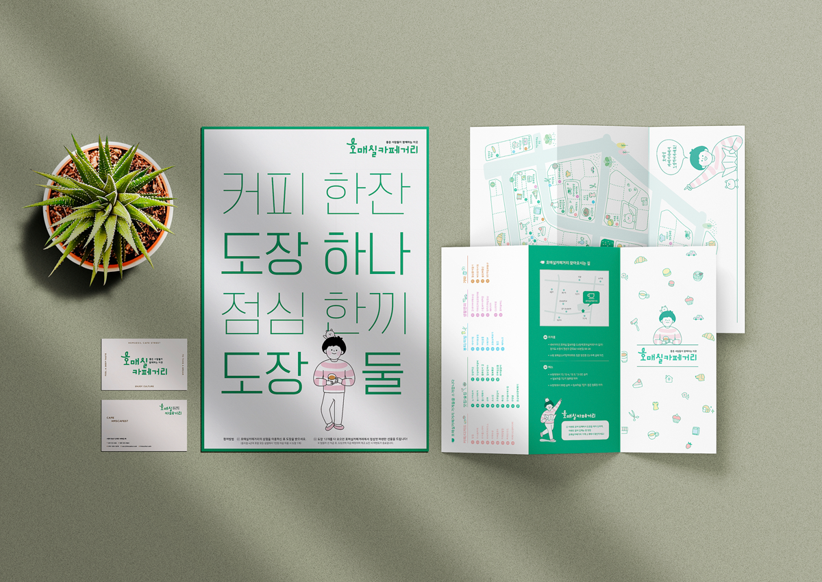 호매실 카페거리는 수원시 지원 사업으로 선정된 호매실 상업 지구의 상인들이 모여 상가 단지 전체를 브랜딩하는 작업이었습니다. 상가 단지 전체를 상징할 CI와 캐릭터 디자인을 기초로 전체 상권 운영에 필요한 안내 리플렛, 포스터, 쿠폰은 물론 굿즈 개발까지! 상가 단지 뿐만 아니라, 인근 지역 상권의 활성화를 위해 대대적인 작업을 진행하였습니다.