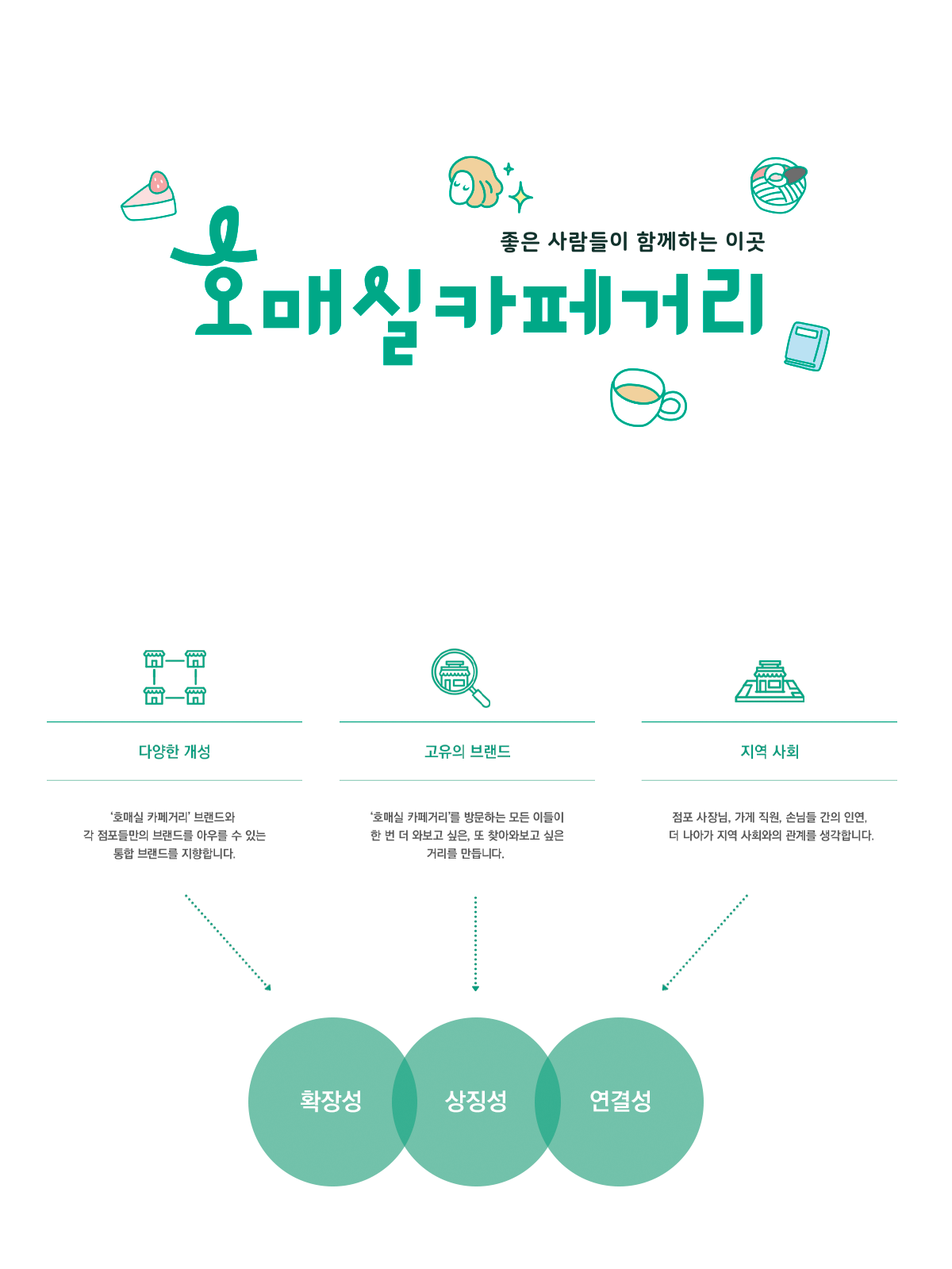 점포 사장님, 가게 직원, 손님들 간의 인연. 더 나아가 지역사회와의 관계 및 연결성을 진정성 있게 고민하여 호매실 카페거리 통합 브랜드에 대한 만족스러운 결과물을 만들어 낼 수 있었습니다!