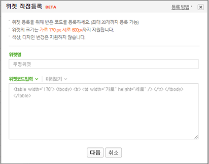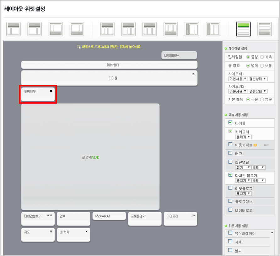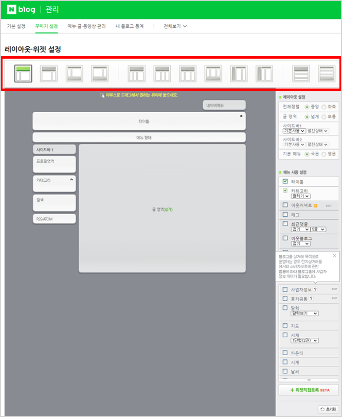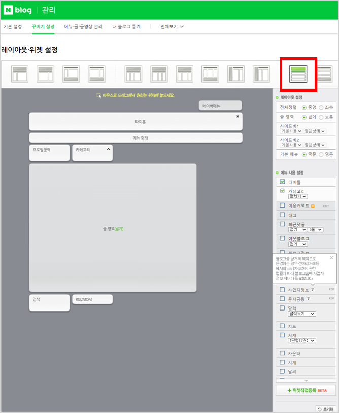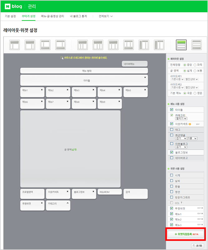 먼저 레이아웃을 빨간 표시된 설정으로 바꾸어 준 걸 다시 한 번 체크한 후 아래 위젯직접등록을 눌러줍니다.