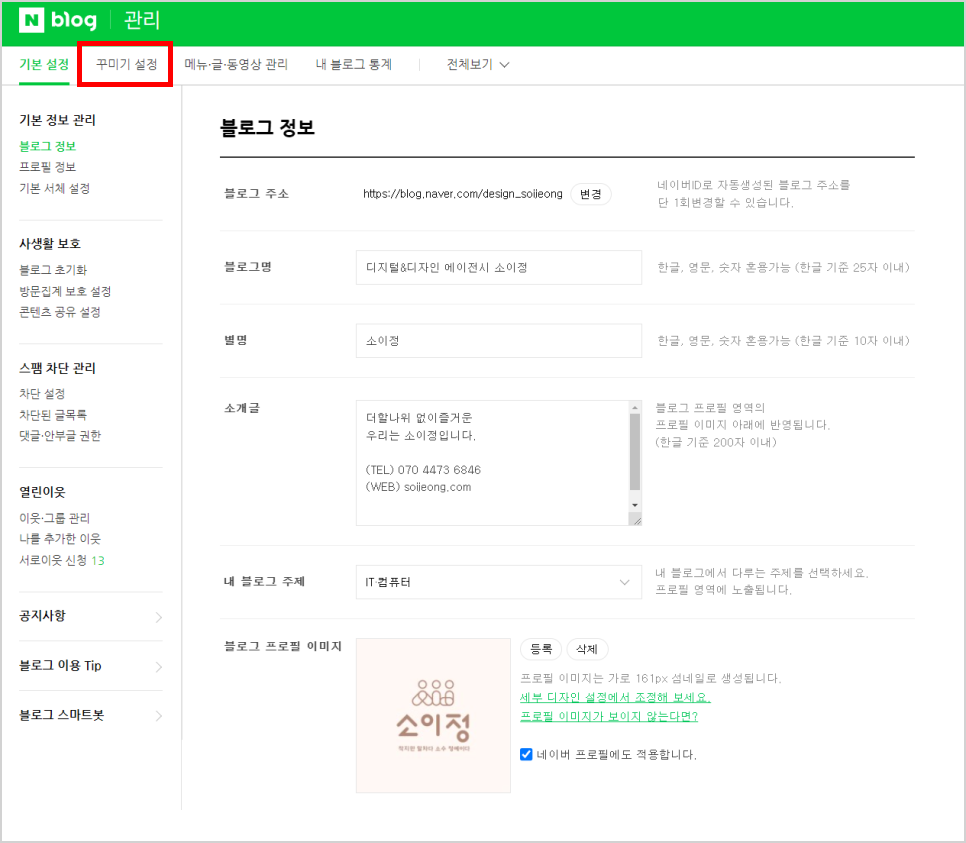 보이시나요? 이렇게 상단 화면이 넓어진 홈페이지형 블로그가 됩니다!