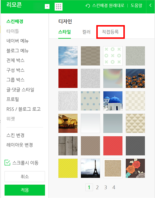 스킨은 크기에 맞는 이미지를 만들어야하기 때문에 레이아웃처럼 바로 바꿀 수 없는데요 ㅠㅠ