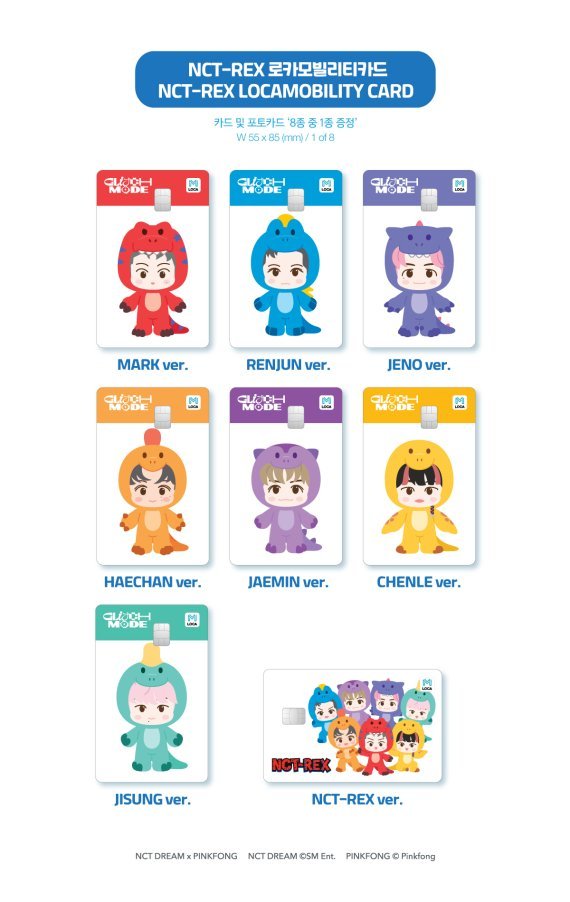 여기 콜라보에 콜라보를 더한 사례가 있습니다! 바로 ‘NCT-REX’ 교통카드인데요. 교통카드 캐시비 발행사인 로카모빌리티는 인기 캐릭터인 핑크퐁과 인기 남자 아이돌 NCT DREAM을 콜라보한 교통카드 8종을 22년 8월 말 출시하였습니다.