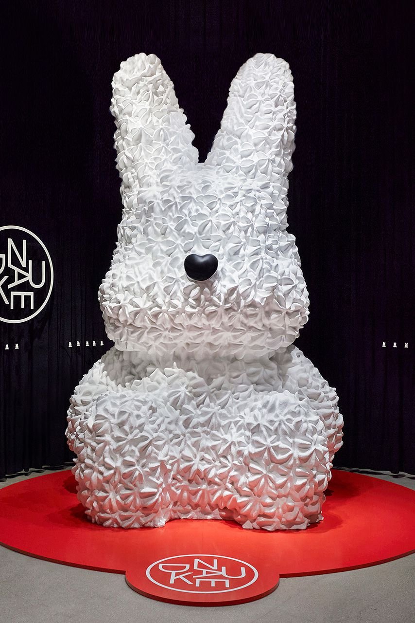 누데이크는 뉴진스를 상징하는 토끼를 재현한 5가지 색깔과 맛을 지닌 케이크와 굿즈 9종(토퍼, 파우치, 엽서, 케이크 나이프 등)을 선보였는데요. 케이크는 컬러풀한 크림을 한 땀 한 땀 아이싱 한 앙증맞은 토끼 모양으로 미각적인 즐거움뿐만 아니라 시각적으로도 큰 즐거움을 선사하며 소비자들의 뜨거운 반응을 얻었습니다. 이뿐 아니라 매장에 배치한 2층 건물 높이의 초대형 토끼 케이크 모형 역시 압도적인 스케일로 인증샷에 진심인 MZ 세대들의 방문 욕구를 자극하기에 충분했습니다!
