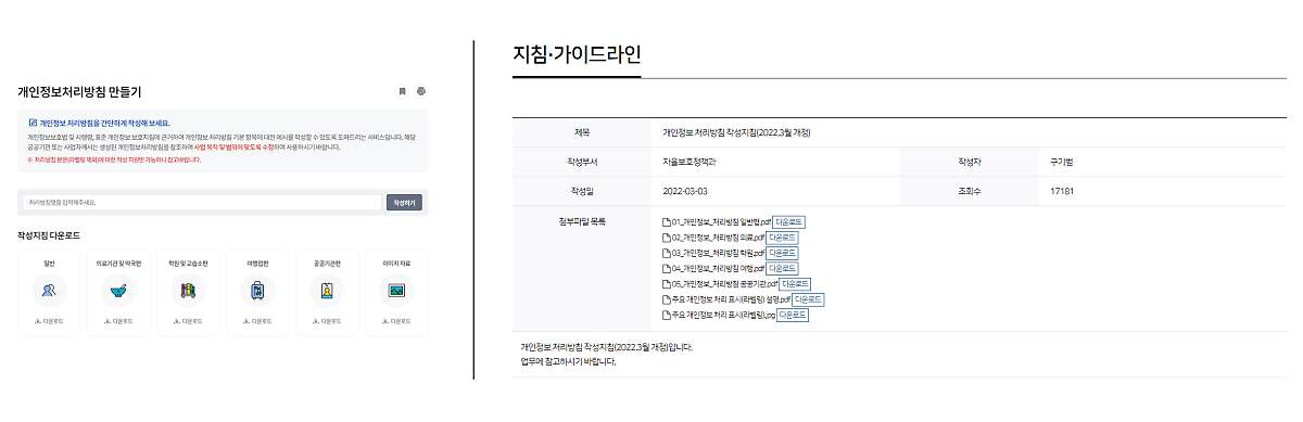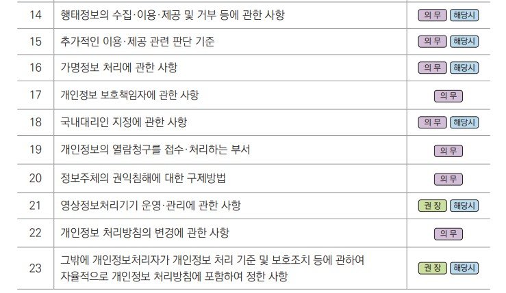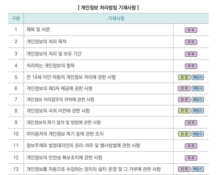 해당 내용은 위에 공유드린 개인정보 포털과 개인정보보호 위원회에서 사업분야별로 다운받아 더욱더 자세하게 확인할 수 있습니다.