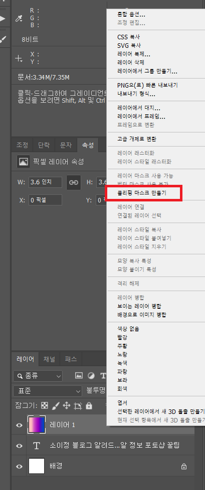 아래로 향한 화살표와 직사각형 모양의 아이콘이 뜨는데요. 이 커서 모양이 바뀔 때 클릭을 해주시면 간단하게 클리핑 마스크가 적용이 됩니다.