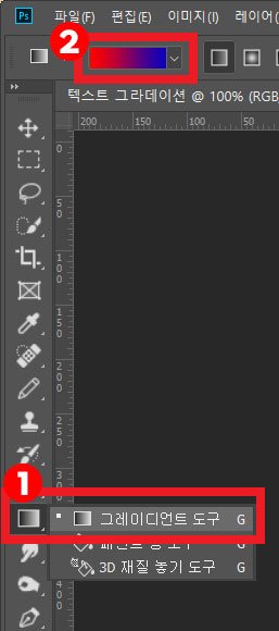 텍스트를 다 적었으면 그레이디언트로 도구를 바꿔주세요. 페이트 통 도구를 꾸욱 누르면 ①그레이디언트 도구가 나와요. 그 후에 ②그레이디언트 편집기를 열어주세요.