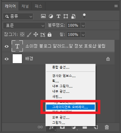 텍스트 입력까지 끝낸 후 fx를 클릭해 그레이디언트 오버레이를 눌러줍니다.