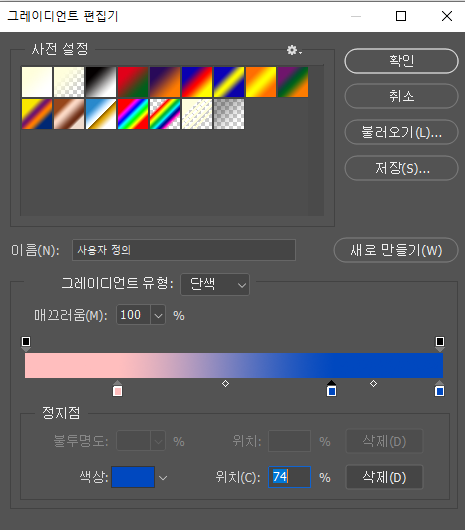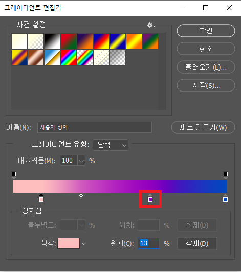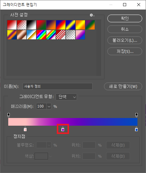마찬가지로 색상을 클릭할 수 있는 그레이디언트 편집기가 나옵니다. 위에서 했던 것처럼 원하는 지점의 색을 지정하고 확인을 누릅니다.