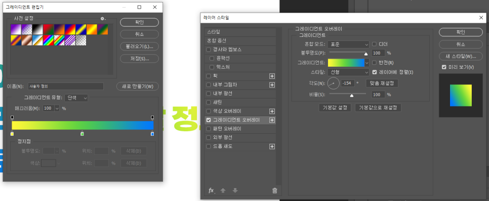 클릭 후 나오는 그레이디언트에서 설정을 변경해 주면 되는데요. 색상 변경은 아래 그레이디언트를 클릭해 줍니다.
