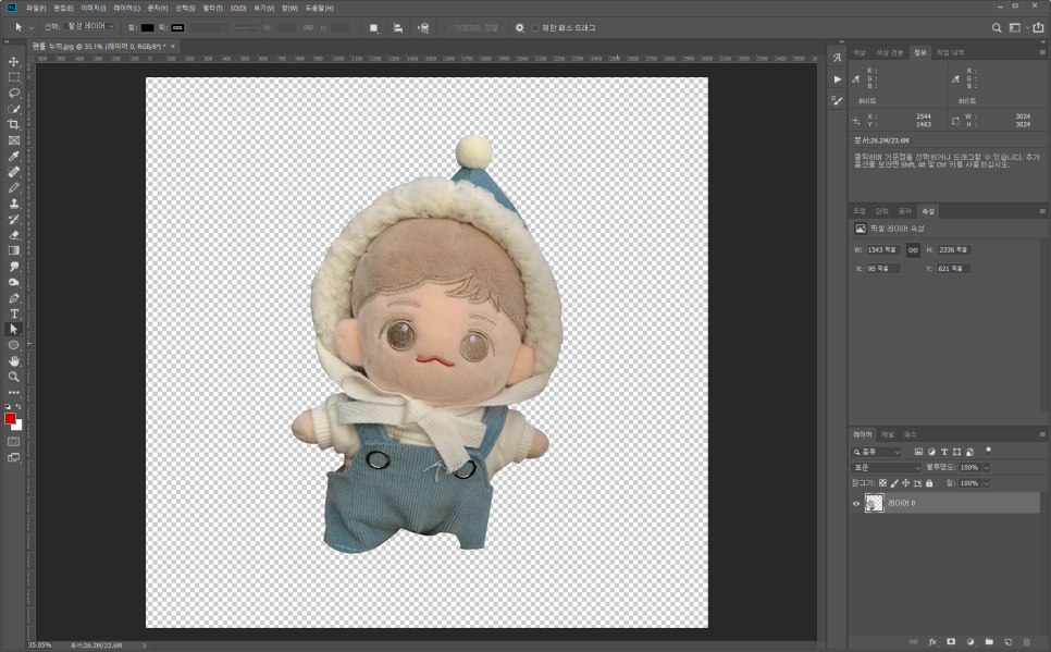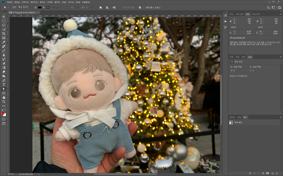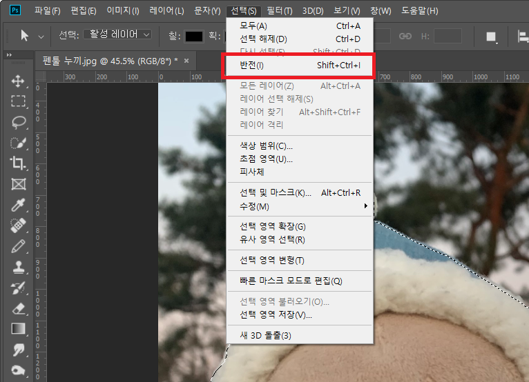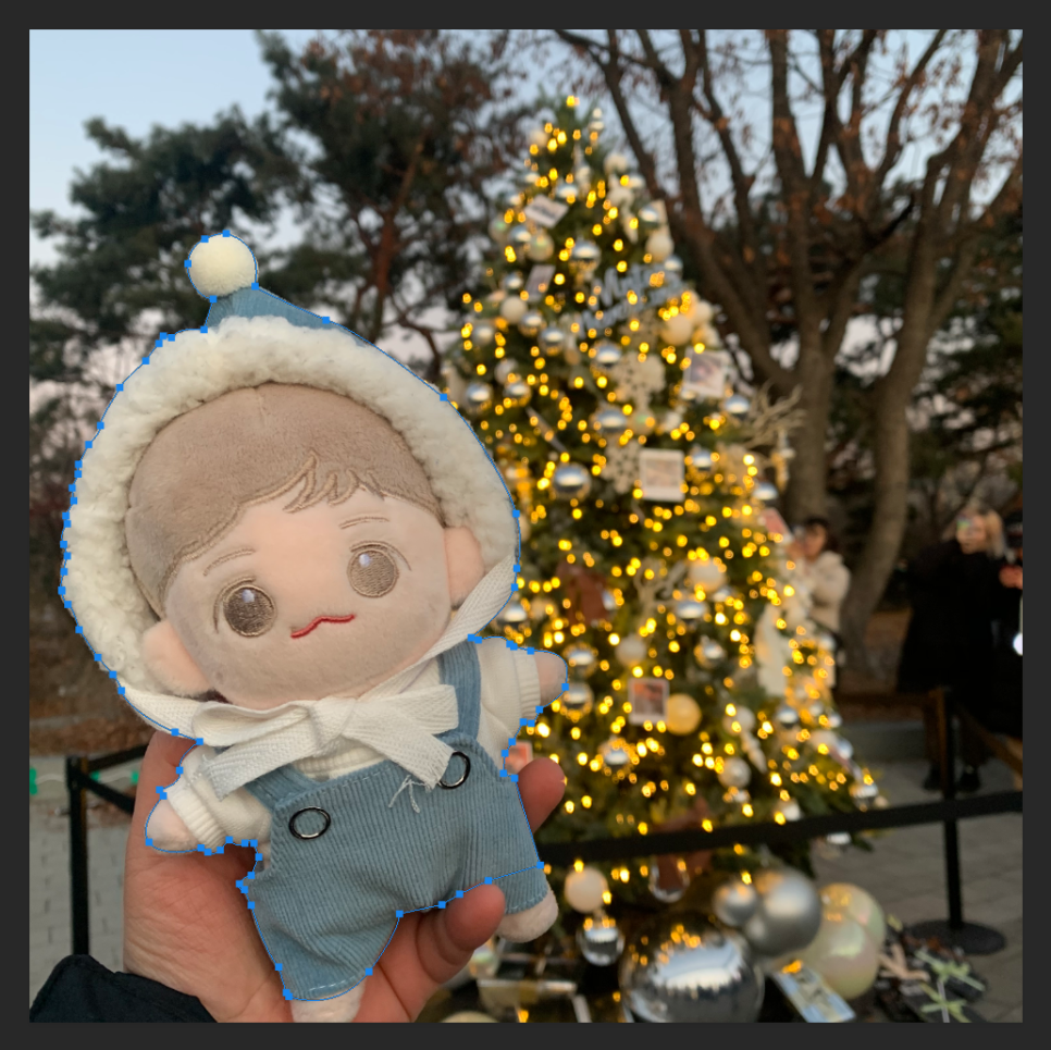 점선의 선택영역으로 변하게 됩니다! 인형 주위로 자글자글한 점선이 보이시나요? 이제 누끼딸 영역을 선택했으니 배경을 삭제해 볼게요! 이 상태에서 단축키 Ctrl + Shift + I를 눌러줍니다.