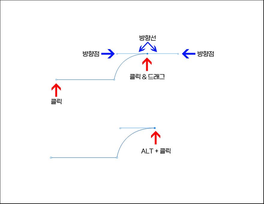 - 곡선은 지점에서 클릭하면서 드래그하면 방향선이 생기면서 곡선이 생깁니다.