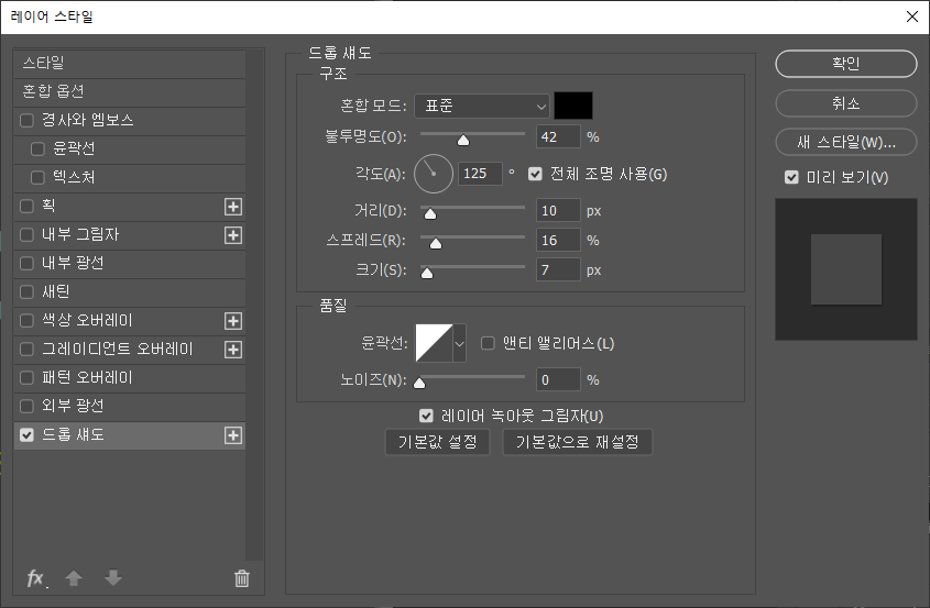 그림자 혹은 드롭 섀도를 클릭해서 불투명도 42% / 각도 125 / 거리 10px / 스프레드 16% / 크기 7px 로 설정해주세요.