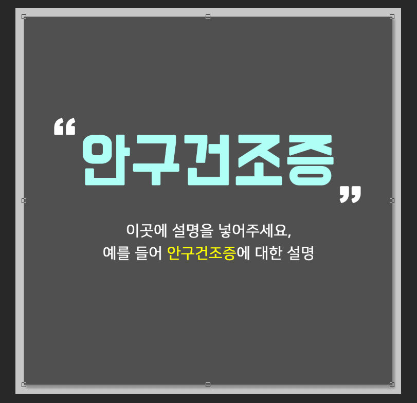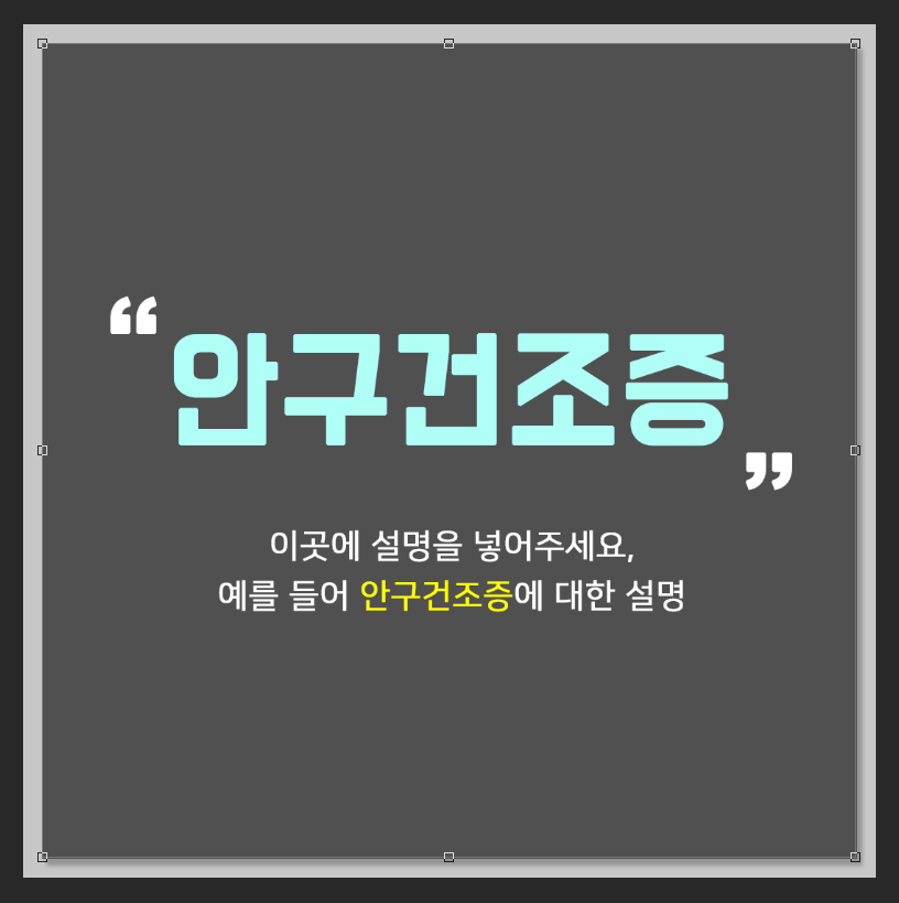 따옴표를 크게 사용하면 강조효과를 줄 수 있습니다. 텍스트 레이어를 새로 만들어서 따옴표를 입력해주세요. 저는 앞 쪽 따옴표를 복사했는데요. 뒤에 올 따옴표는 해당레이어를 클릭한 후 Ctrl + T로 각도를 맞춰줬습니다. 왼쪽 사진이 전, 오른쪽 사진이 후입니다.