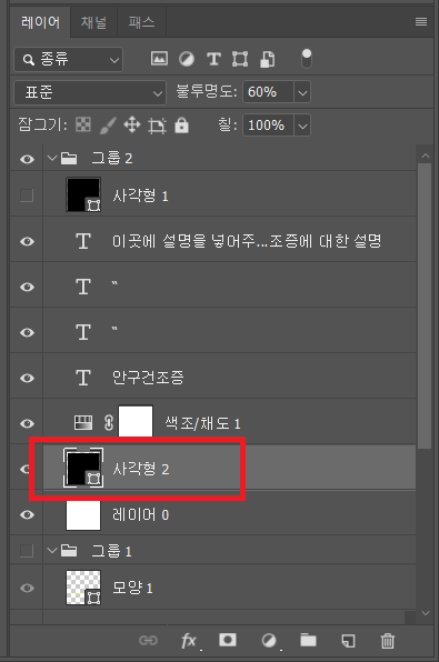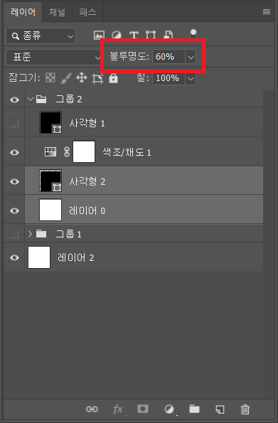불투명도를 조정해줍니다. 저는 60으로 조정했는데, 여러분은 여러분이 원하는 분위기에 맞게 수치를 정해주면 돼요.
