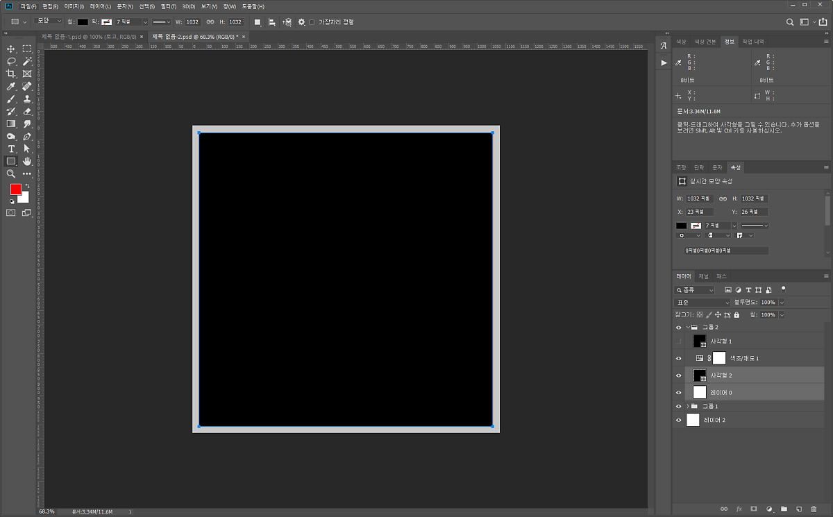 사각형 도구 단축키 U를 누르고 적당한 크기로 배경화면보다 작은 정사각형을 만들어주세요.