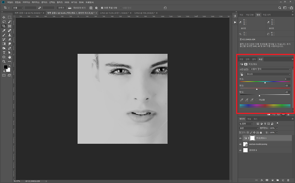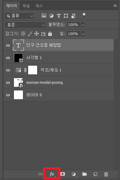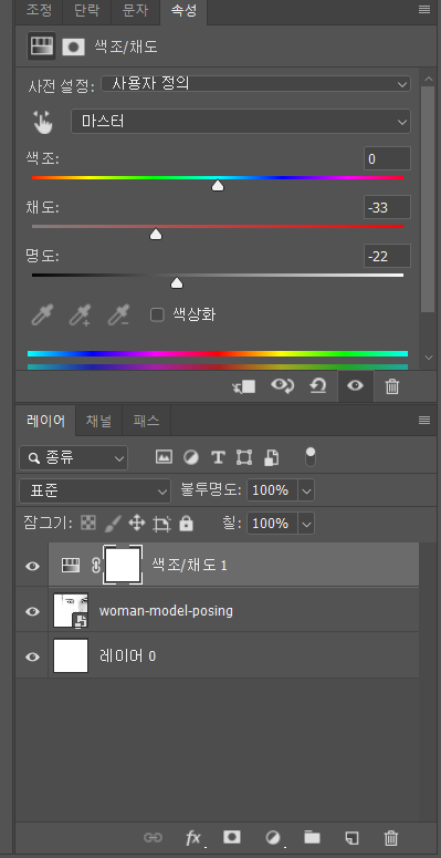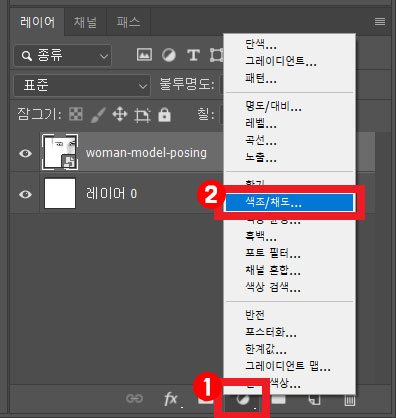 바탕으로 깔릴 이미지는 채도와 명도가 죽어야지 무게감이 있고 글씨가 돋보일 수 있는데요. 그러기 위해 레이어패널 하단 레이어 창에서 조정 레이어를 누른 뒤 색조/채도 레이어를 추가해줍니다.