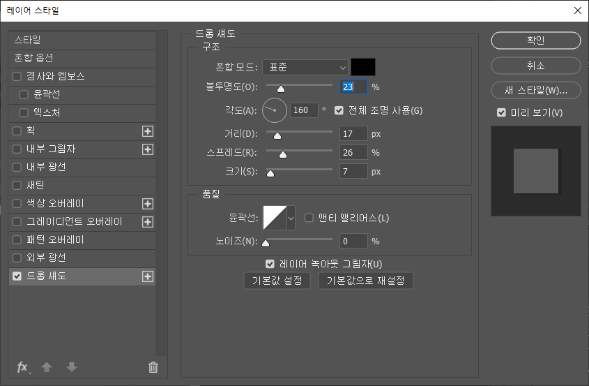 저는 불투명도 23% / 각도 160 / 거리 17px / 스프레드 26% / 크기 7px로 설정했습니다.