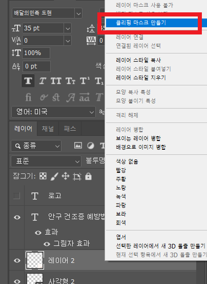 그리고 로고레이어 우클릭을 하면 메뉴가 나오죠! 클리핑마스크 만들기를 누릅니다.
