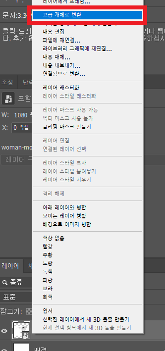 사진 레이어가 생겼죠? 사진이 있는 레이어에 마우스 오른쪽 버튼을 클릭하여 고급 개체로 변환을 해줍니다.