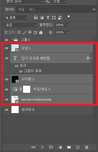맨 마지막 레이어를 제외한 나머지 레이어를 모두 클릭해주신 후 그룹창 안에 넣어주세요.
