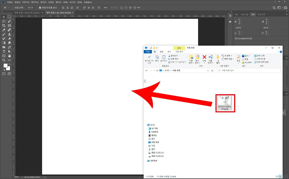원하는 사진을 불러옵니다. 사진을 포토샵 영역으로 드래그 앤 드롭해주시면 돼요.