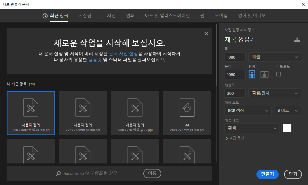 카드뉴스를 많이 사용하는 인스타그램 최적 사이즈 1080*1080로 새 문서를 만듭니다.