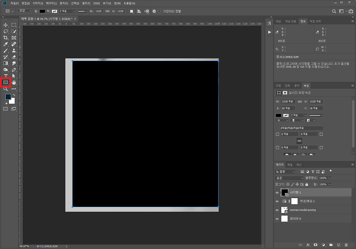 다음은 도형이나 선, 텍스트로 카드뉴스를 꾸며볼 건데요. 왼쪽 도구창에서 사각형 도구를 클릭해주세요. (단축키 : U) Shift를 누르고 마우스를 드래그하면 정사각형 도형이 그려집니다.