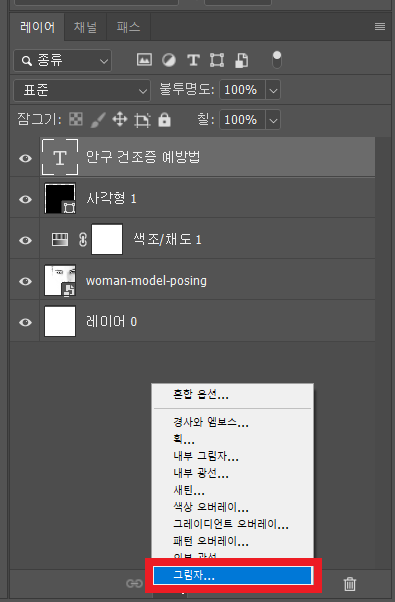 글씨에 양감을 넣기 위해 레이어 스타일에 그림자를 클릭해주세요.