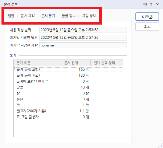 이렇게 문서 정보 창이 뜨면 상단 메뉴에서 문서 통계로 들어가 글자 (공백 포함) 글자 (공백 제외)를 확인하실 수 있습니다~~