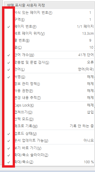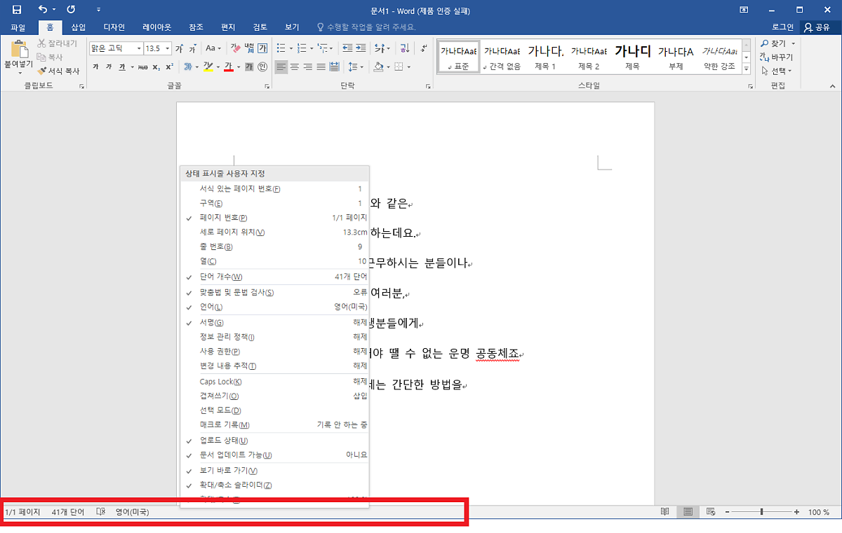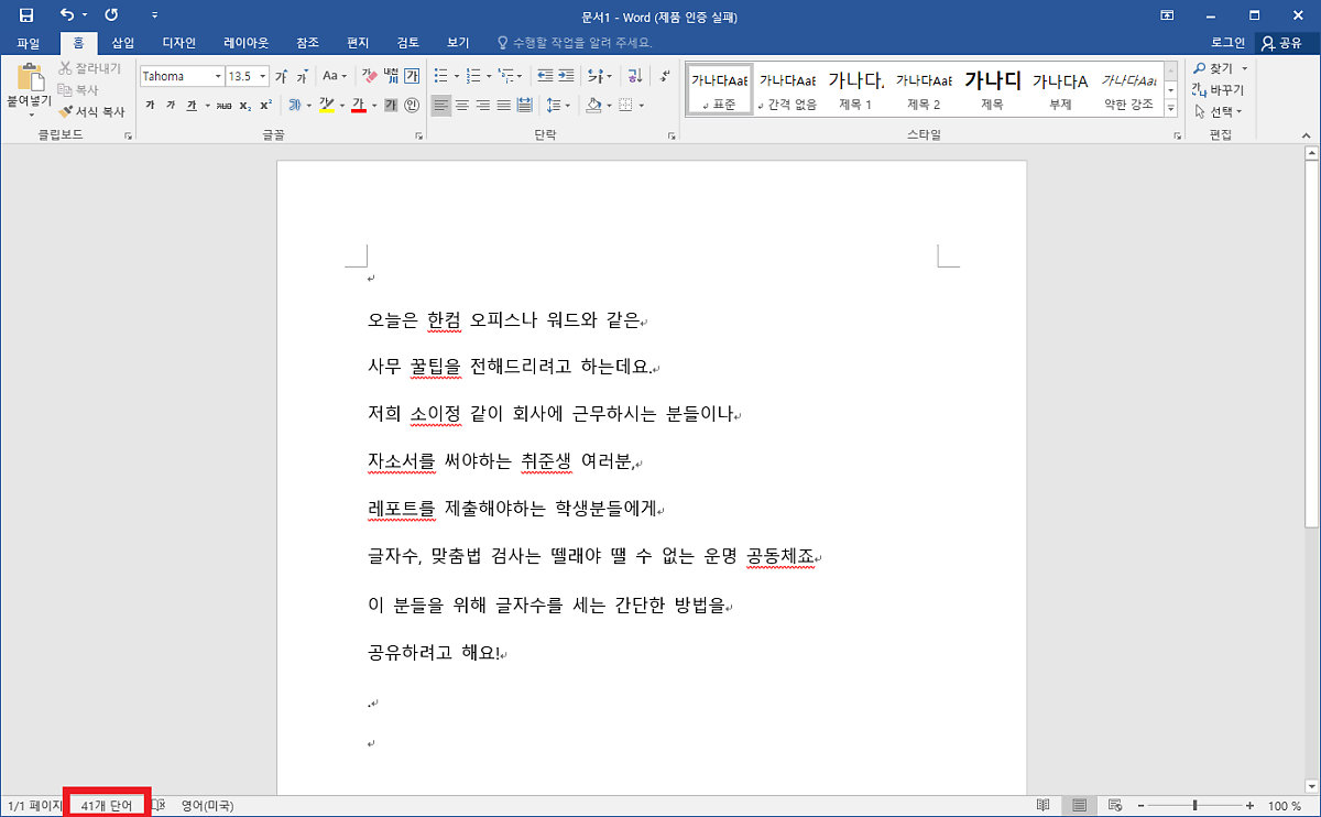 워드의 하단 부분! 빨간색 네모를 보면 "N 개 단어"가 보이시나요?