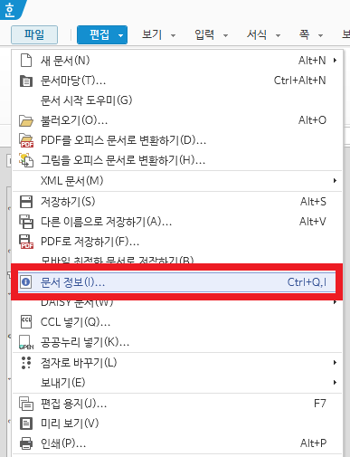 파일 - 문서정보를 클릭합니다. Ctrl + Q, I를 눌러도 된답니다~