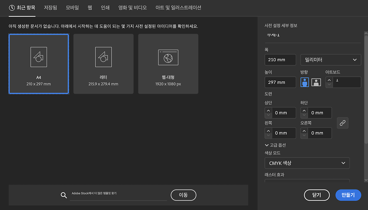 Ctrl + N 을 누르면 새 문서 만들기가 뜨는데요. 원하는 프로젝트 크기를 설정하고 만들기를 클릭합니다.
