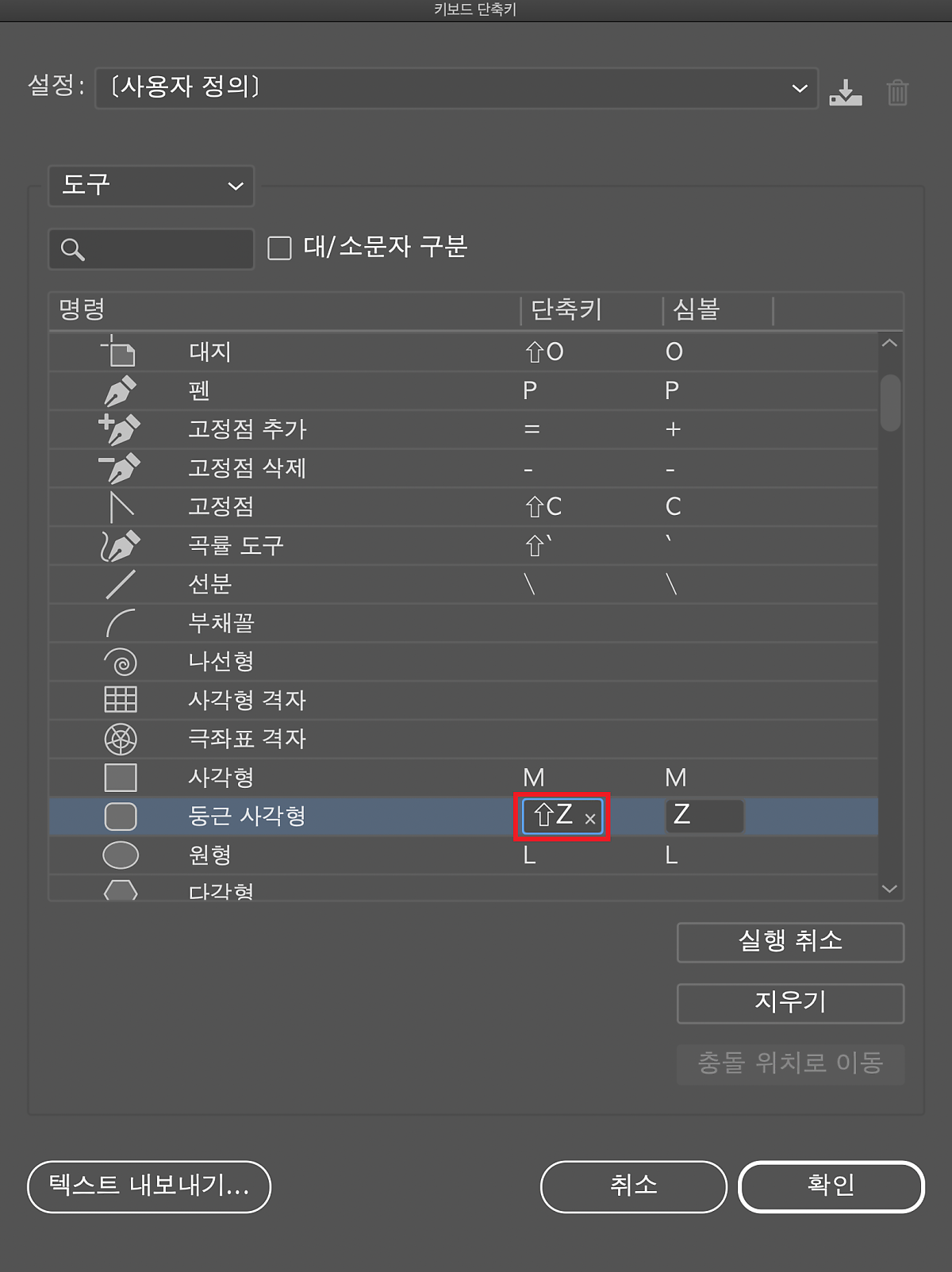 입력하는 방법은 단축키 칸을 클릭한 후 원하는 단축키를 동시에 누르면 되는데요. 단축키를 입력하는 것처럼요! 저는 둥근 사각형에 Shift + Z를 지정해볼게요. 빈칸을 Shift + Z를 입력하면 둥근 사각형의 단축키가 지정된 것을 볼 수 있답니다~