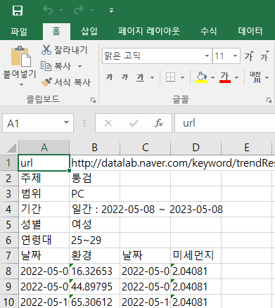엑셀파일로 상세한 지표를 확인할 수 있는데요. url, 주제, 범위, 기간, 성별, 연령대, 날짜까지 검색한 그대로 나오니 정렬만 제대로 해주면 원하는 정보를 빠르게 찾을 수 있답니다~