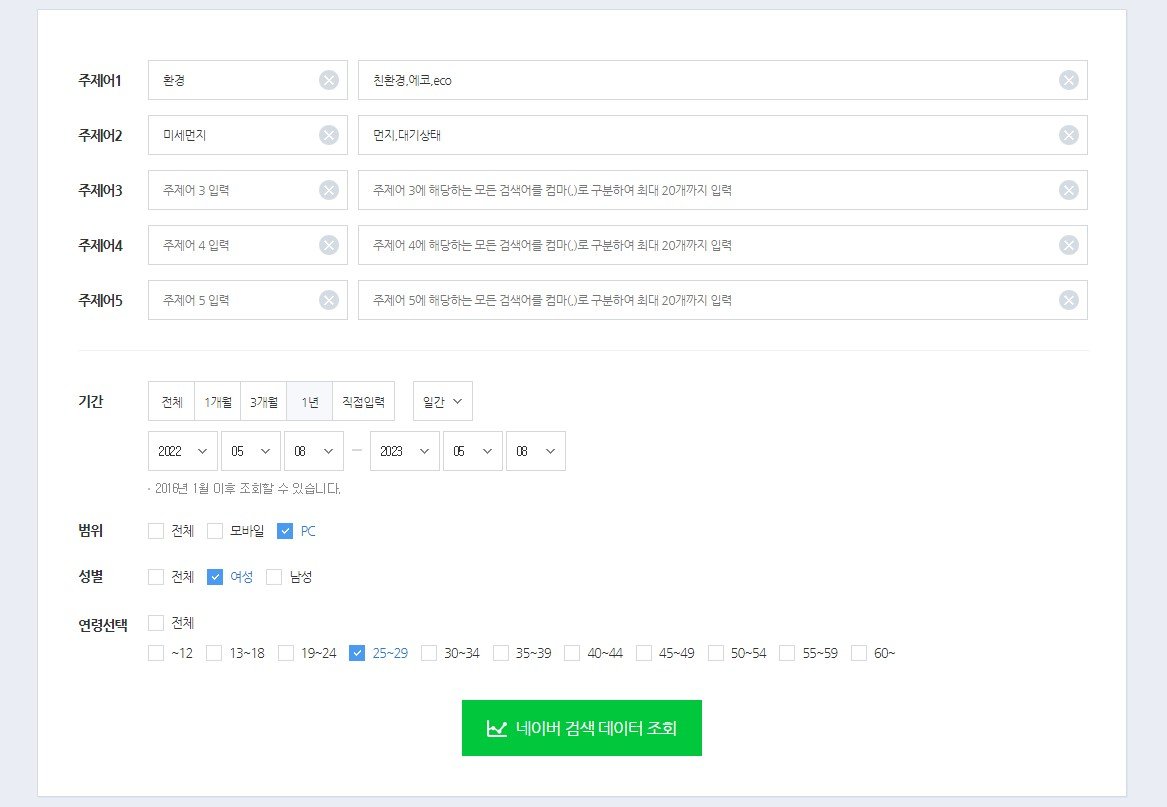 저는 PC에서 환경과 미세먼지를 20대 중반의 여성 유저가 얼마나 많이 검색하는지 조회해 보았습니다.