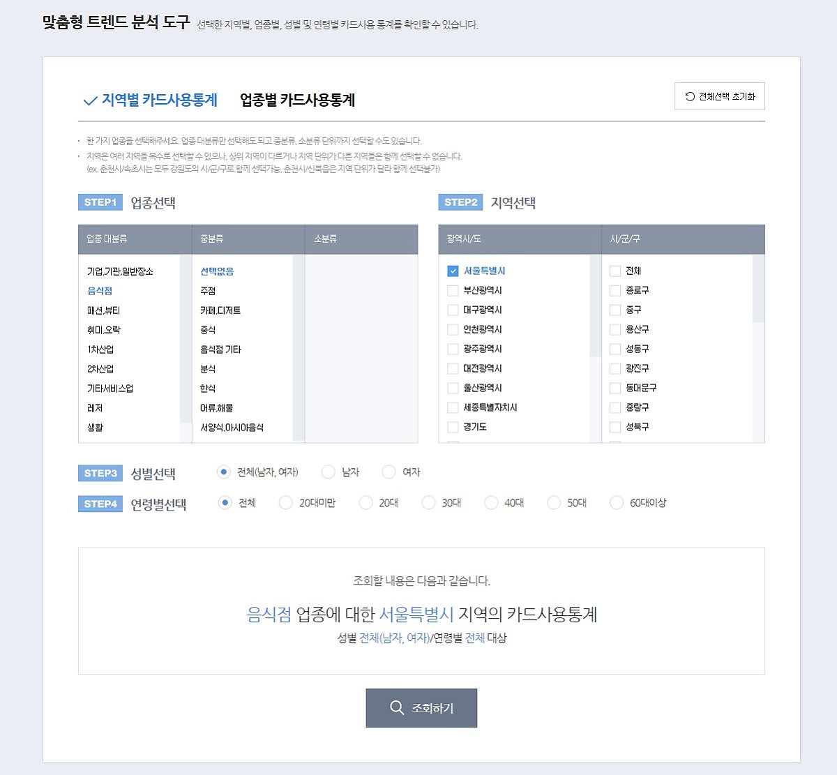 데이터랩에서는로도 조회 가능한데요. 이는 BC카드에서 제공하는 정보이며, 원하는 업종, 성별, 연령별로 나누어 내용을 조회할 수 있습니다. 해당 기능을 통해 결제 금액에 따른 상위 랭킹과 결제 횟수도 확인 가능합니다.