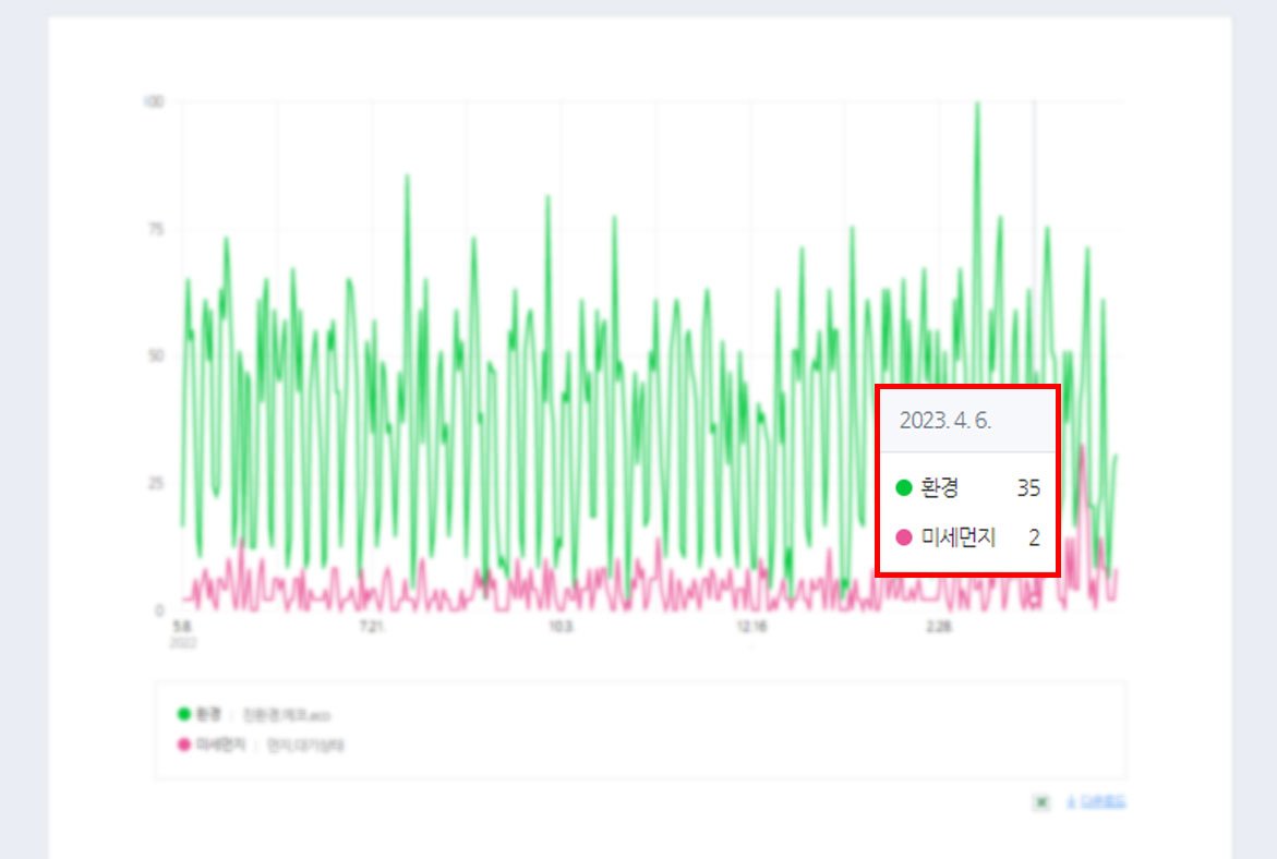 환경이라는 키워드가 의외로 많네요! 자세히 살펴볼까요? 마우스를 그래프에 얹으면 그날의 데이터를 확인할 수 있습니다.
