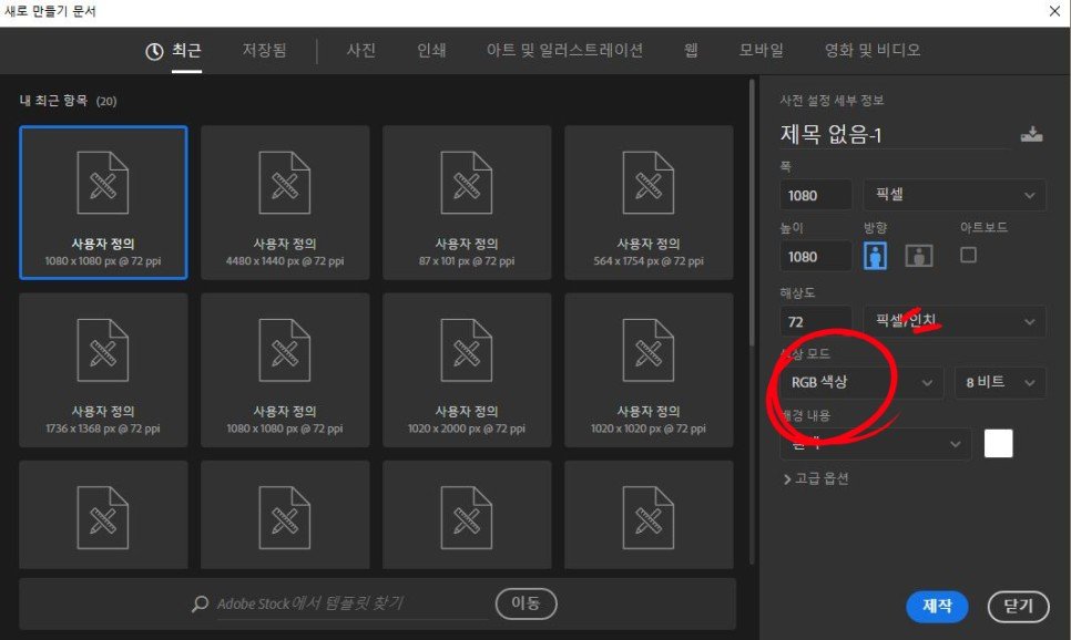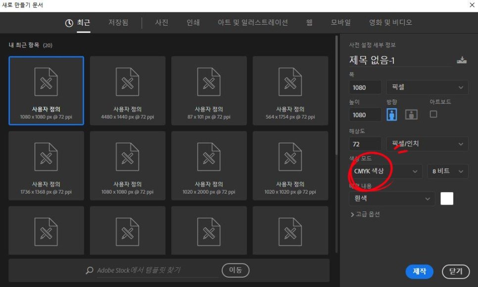 새 문서를 열면 RGB 색상인지 CMYK 색상인지 먼저 선택할 수 있어요. 빨간색으로 표시된 부분이 바로 색상 모드를 변경할 수 있는 곳입니다. 인쇄물을 작업할 예정이라면 CMYK를, 웹디자인이나 카드 뉴스와 같은 디지털 콘텐츠를 작업할 예정이라면 RGB를 선택한 후 제작해주세요~