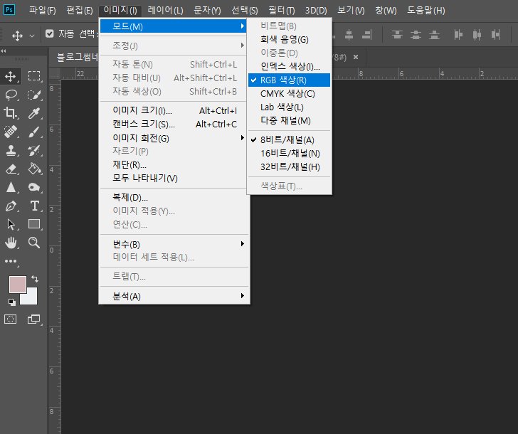 [이미지 - 모드]를 선택 후 RGB 색상 또는 CMYK 색상을 눌러 모드를 변경해주시기만 하면 끝!