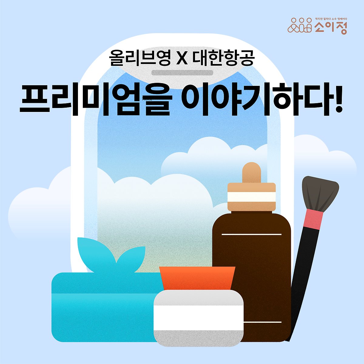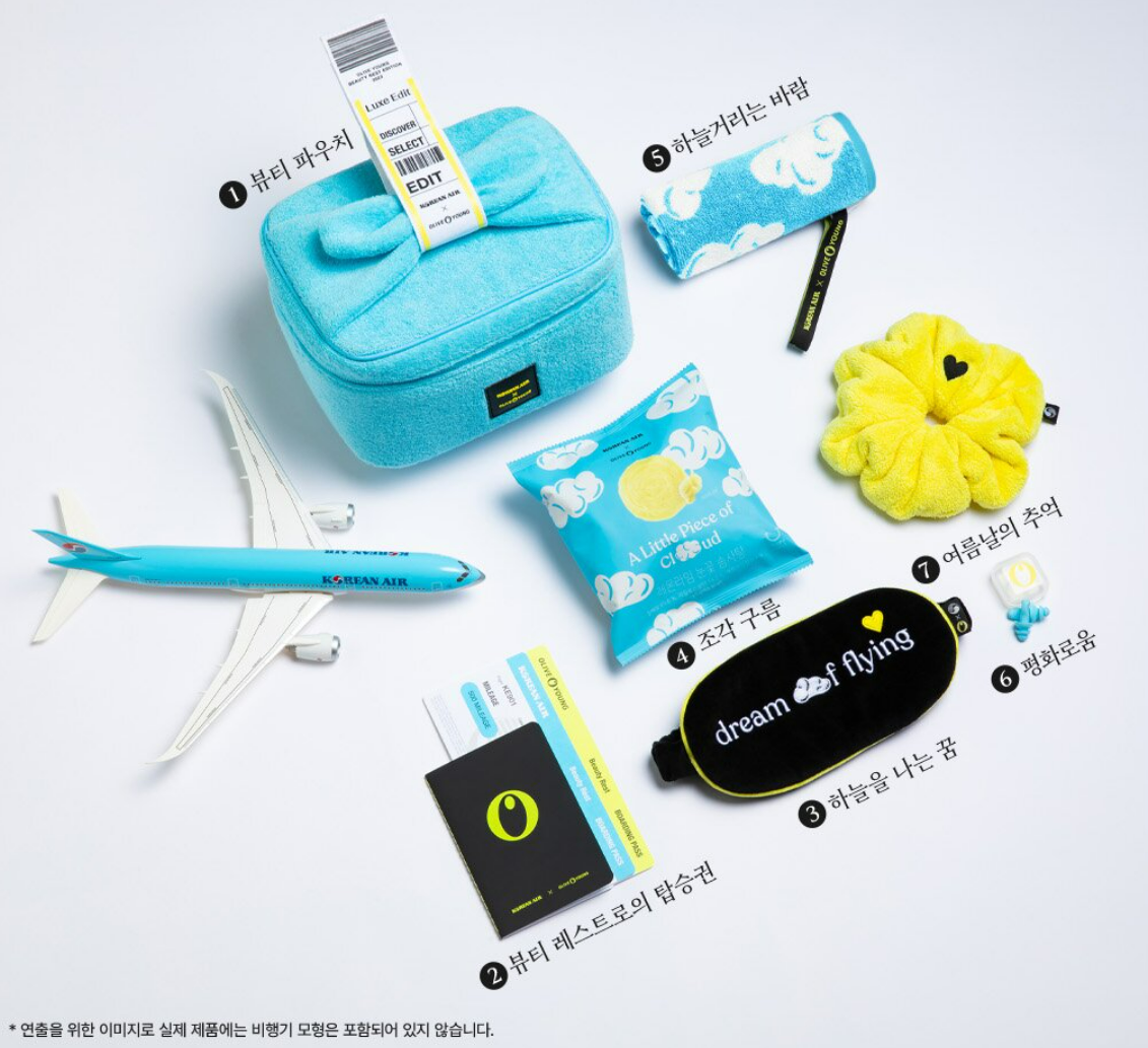 또한 올리브영은 프리미엄한 럭스에디트 서비스의 정체성을 효과적으로 알리기 위해 플래그 캐리어(국가를 대표하는 주력 항공사)인 대한항공과 콜라보 제품을 출시하였다고 해요! 대한항공은 국내 프리미엄 항공사로 이미 잘 알려져 있으니 그 이미지를 럭스에디트에도 심어보고자 한 것이죠!