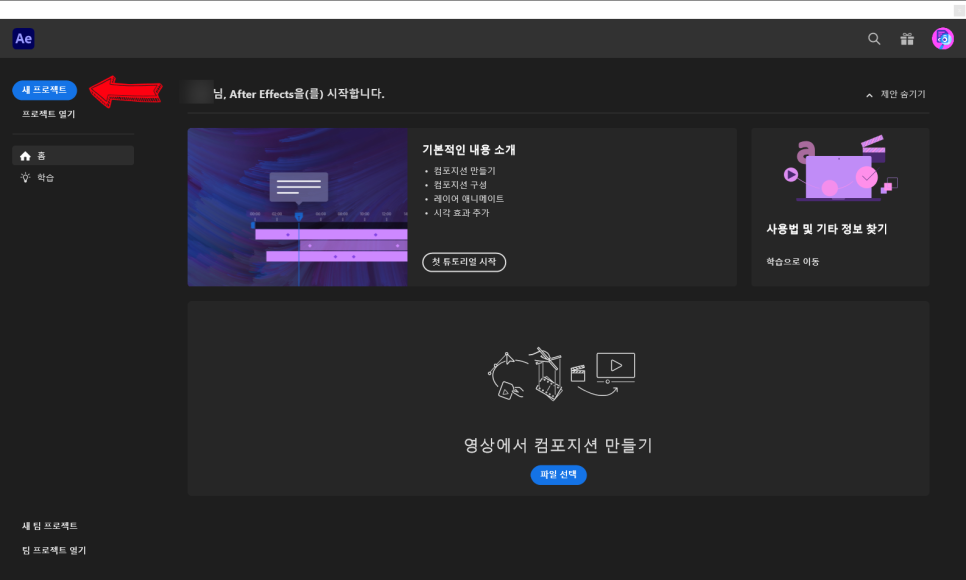 기본적인 세팅을 알아보기에 앞서! 먼저 에펙을 실행하고 새 프로젝트를 생성해 주세요.