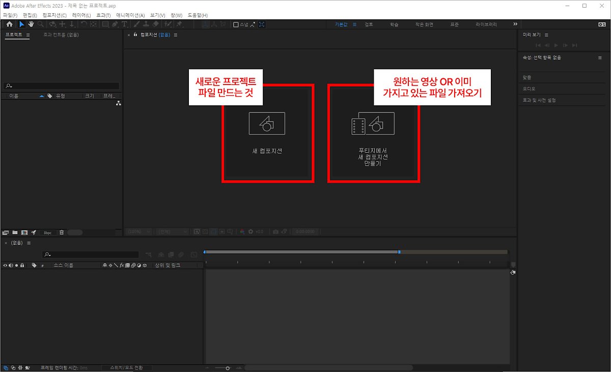 그러고 나오는 화면인데요. 당황하지 않고 새로운 프로젝트를 만드는 것이면 새컴포지션, 아니라면 푸티지에서 새 컴포지션 만들기로 선택해 주세요!