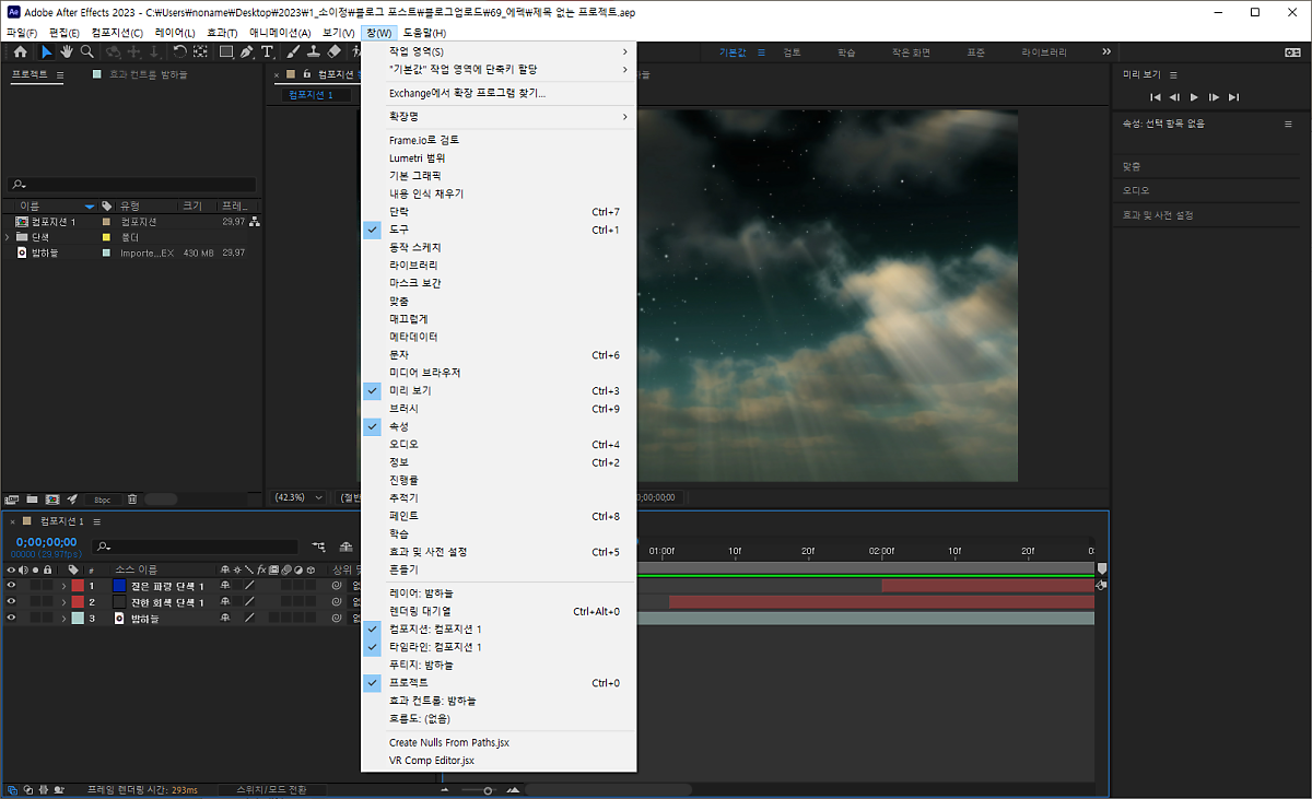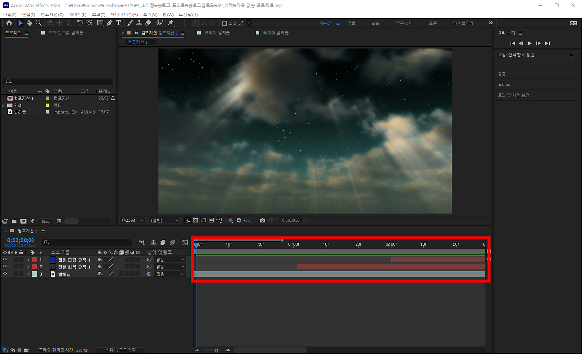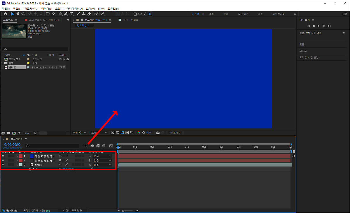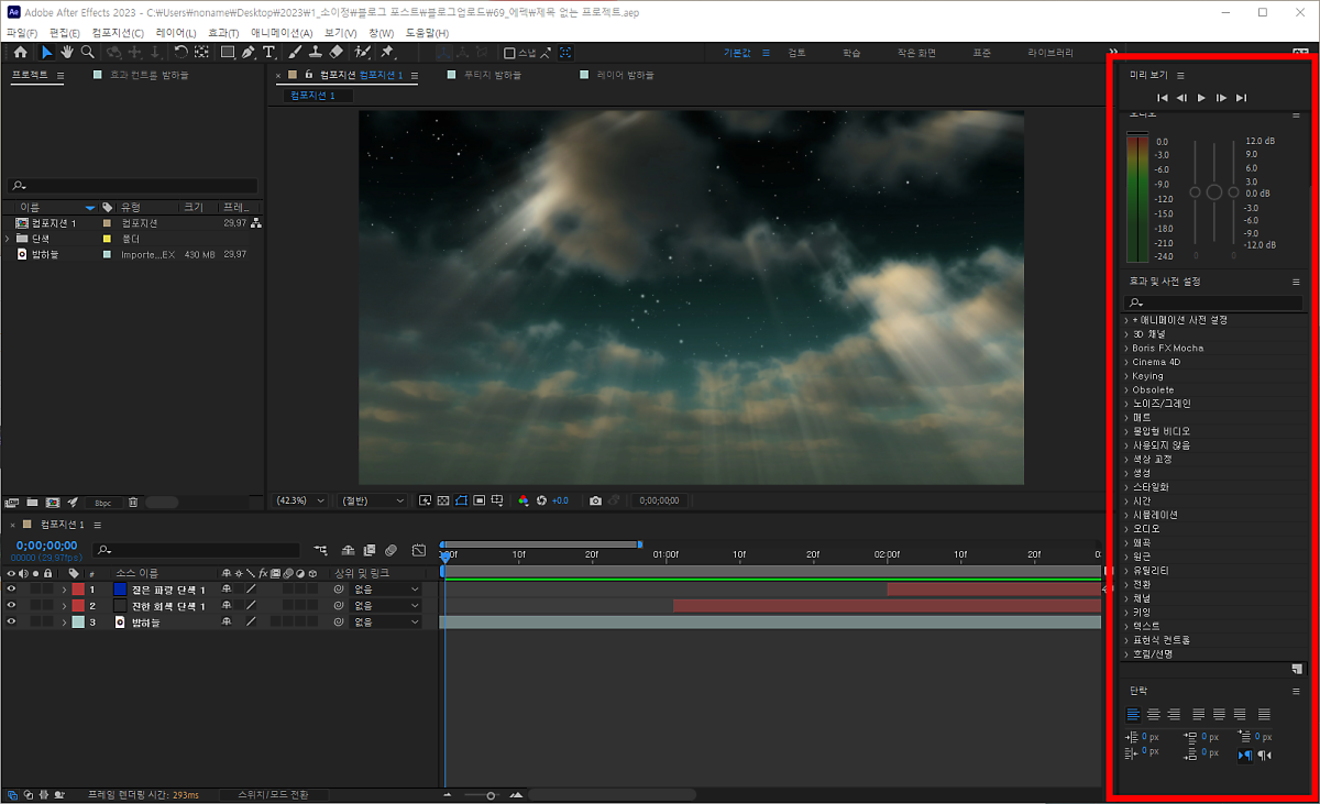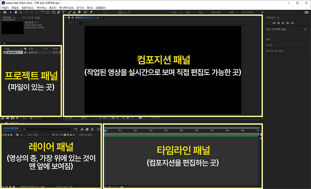 여기까지 에펙을 구성하는 화면을 간단하게 알아보았습니다.