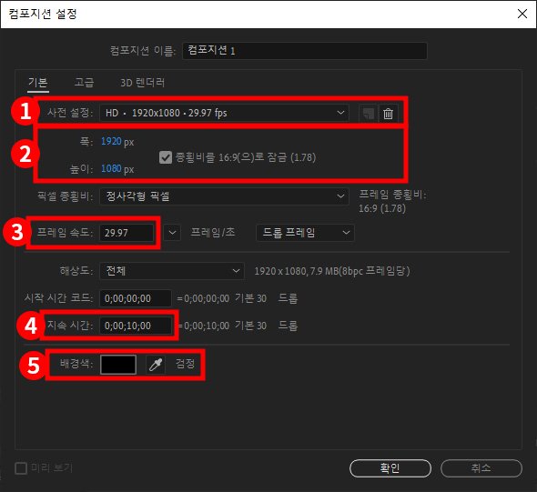 새컴포지션을 클릭할 경우 아래 창이 뜨는데요. 아래 화면은 작업하기 전 작업환경을 설정해준다고 보면 됩니다.