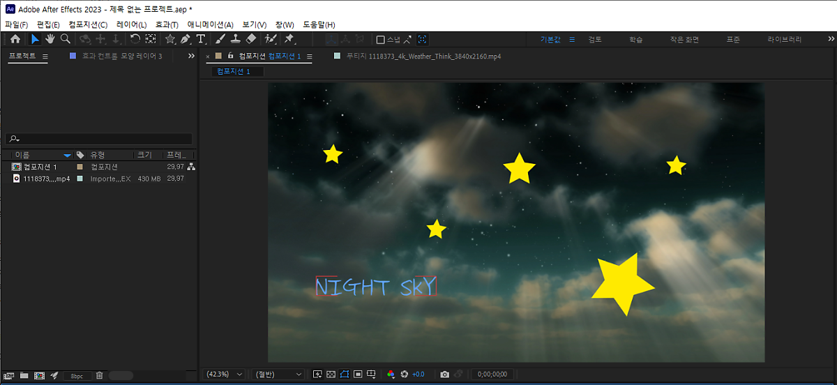 아래는 툴바를 이용한 예시인데요. 텍스트 추가와 별을 그려봤어요. 또한 아까 말한 컴포지션 패널에서는 직접적으로 작업이 가능하다는 점이 바로 이런 점입니다! 텍스트를 바로 넣고 별 모양도 바로 넣고 조정이 가능한 점! 참고하세요~!
