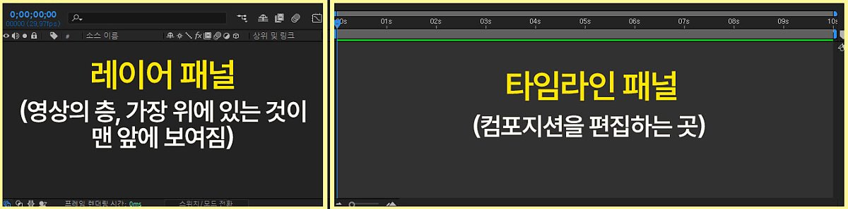 프리미어 - 트랙 개념, 에펙 - 레이어 개념이라고 보시면 될 것 같아요. 레이어 패널은 타임라인 패널 옆에 있습니다. 타임라인 패널은 컴포지션을 편집하는 패널이며, 레이어가 나타나는 시간이나 효과의 발생 시점을 조절할 수 있답니다!