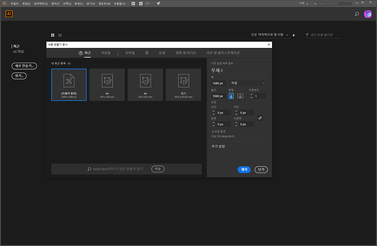 제일 먼저 일러스트를 켜고 프로젝트를 생성해줍니다. 오늘도 예시로 만드는 거라 사이즈는 여러분 마음대로 하셔도 됩니다. 저는 1080*1080으로 진행해볼게요.
