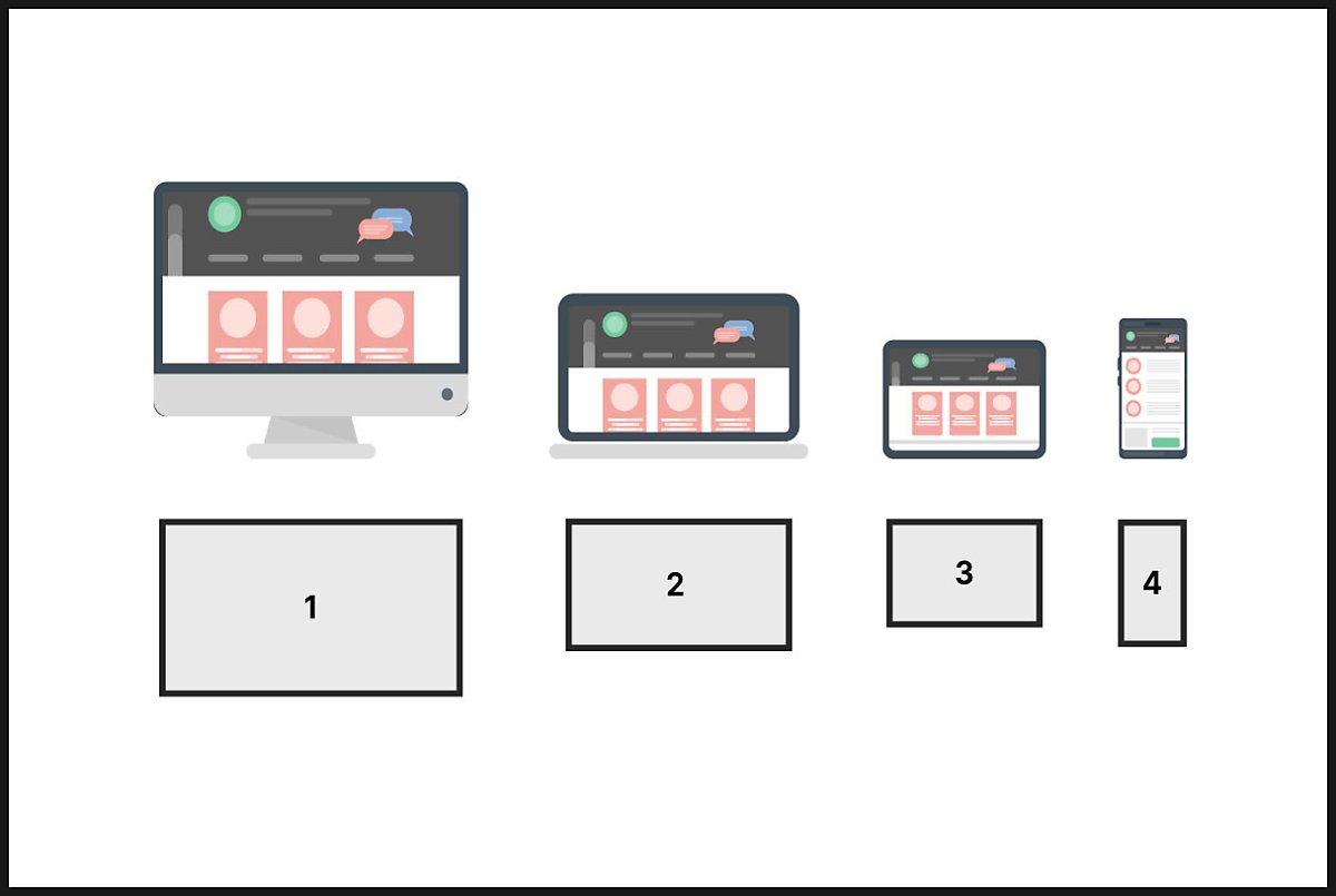 이해하기 쉽게 또 다른 그림을 보면서 설명을 드려볼게요. 기기의 화면의 해상도가 PC 모니터 정도라면 1, 노트북 화면 정도라면 2로, 아이패드 탭 정도라면 3로, 핸드폰 화면 정도라면 4라는 화면으로 보이도록 개발된 것이 바로 적응형 웹이라고 보시면 됩니다. 각각 레이 아웃별로 제작하여 사용하는 기기에 맞게 웹페이지를 보여주는 거죠!