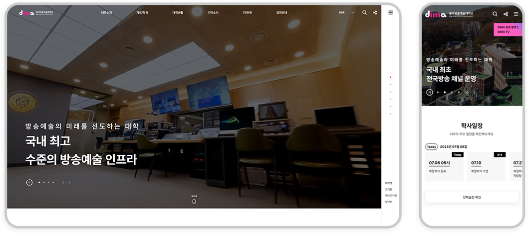 마찬가지로 홈페이지에 접속해서 브라우저의 가로 사이즈를 계속해서 줄여보세요. 사진/영상의 크기, 로고의 위치, 배열 등이 오른쪽처럼 점점 변하게 됩니다.